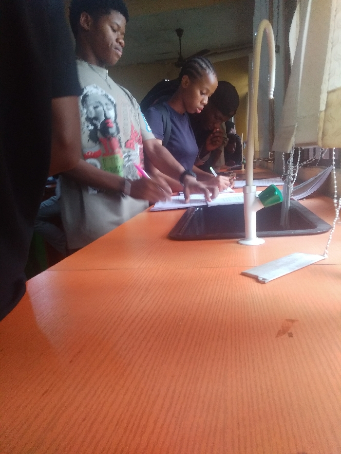 The image depicts an indoor scene within a laboratory or classroom setting in Ihiagwa, Nigeria