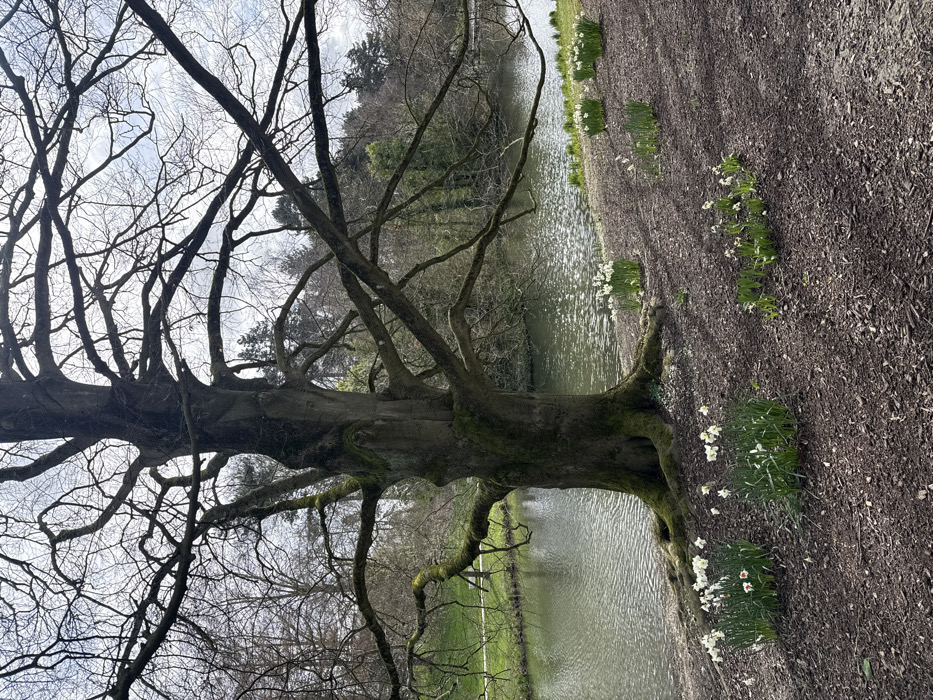 This image captures a tranquil park landscape in Roubaix, France, during what appears to be early spring. A large, mature deciduous tree, with a substantial, moss-covered trunk and numerous bare, gnarled branches, dominates the central and upper portions of the frame. Its roots are visibly splayed across the immediate foreground. The ground in the foreground is covered in dark brown mulch or bare earth, upon which multiple clusters of white daffodils (Narcissus) are in bloom, primarily in the lower-left and mid-right, some exhibiting orange centers. Immediately to the left of the central tree, a calm body of water, indicative of a pond or lake, reflects the sky and displays gentle ripples. The opposite bank of the water features a strip of vibrant green grass and a paved pathway. Beyond this, a dense collection of trees, a mix of bare-branched deciduous varieties and some evergreens, forms the background. The sky is partially cloudy, showing areas of light grey and pale blue through the tree canopy. No individuals or overt human activity are depicted in the scene.