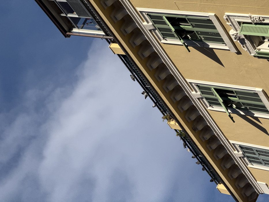 - "The image displays the upper section of a multi-story building facade in Sanremo, Italy, viewed from a low angle against a blue sky with scattered white clouds" by FM-17PKw1, licensed under CC BY 4.0