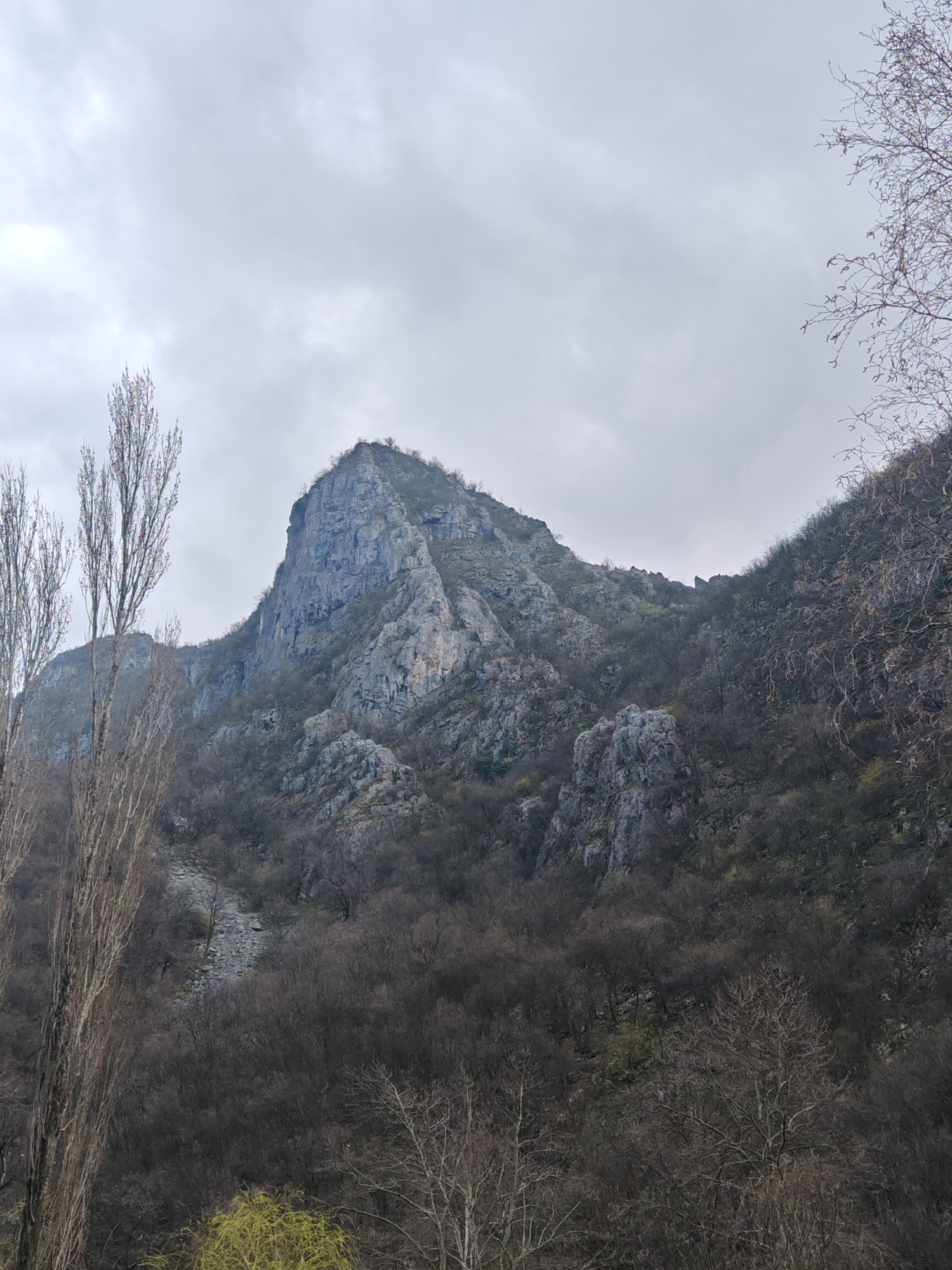 The image depicts a mountainous landscape, likely located in or near the city of Vratsa, Bulgaria, given its distinctive rock formations. The scene is dominated by a large, rocky mountain with visible geological features and sparse vegetation on its slopes. The foreground is filled with a dense forest of bare trees and shrubs, indicating either a late autumn or early spring season. The sky is overcast with grey clouds, creating a muted, diffused light throughout the scene. There are no visible people or animals.