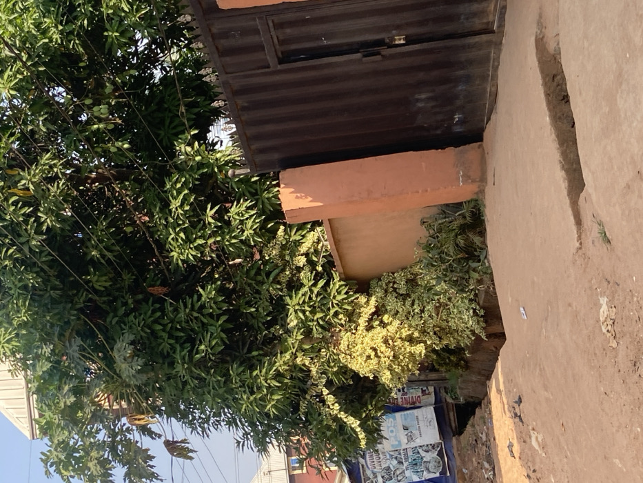 The image depicts an outdoor scene in Oba-Aboji, Nigeria, characterized by dense vegetation, an unpaved road, and structural elements under clear daylight