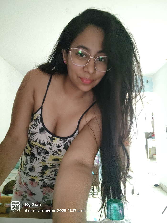 An indoor, front-facing close-up photograph depicts a female subject with long, dark, straight hair. She wears rose gold-framed eyeglasses, displaying green light reflections, and pink stud earrings. Her lips are lightly colored pink, showing a subtle smile. The subject is dressed in a camisole or thin-strapped top featuring a floral pattern: white and yellow sunflowers on a dark ground at the top, transitioning to pink and green flowers on a white ground below. Her left arm is visible, extended towards the foreground, suggesting she is holding the camera. The background consists of light-toned, possibly white or light grey, walls, partially blurred. A clear bottle with a green cap is visible in the lower right foreground, and indistinct objects, possibly shoes on a shelf, are present in the mid-right background. The image is timestamped "6 de noviembre de 2025, 11:37 a. m." The scene is located within a domestic environment in Cali, Colombia.