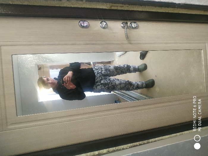 The image depicts a male individual taking a mirror selfie indoors in an unspecified building within Гаревая, Russia. The man, appearing to be an adult, stands facing the camera's reflection. He wears a black hooded sweatshirt, grey and white digital camouflage pattern pants, and dark green boots. He holds a smartphone with both hands at chest level, capturing his reflection. A bright light source, possibly a window, is visible behind and to the left of his head. The mirror is integrated into a light-colored wooden or laminate door equipped with a chrome handle and two circular chrome lock mechanisms. The door frame and surrounding wall exhibit elements consistent with an unfinished or renovated indoor space, including what appears to be exposed insulation or building materials to the right of the door and a concrete-like floor. Another pair of dark shoes or slippers rests on the floor to the right of the man's reflection. A "REDMI NOTE 6 PRO MI DUAL CAMERA" watermark is present in the lower left corner.