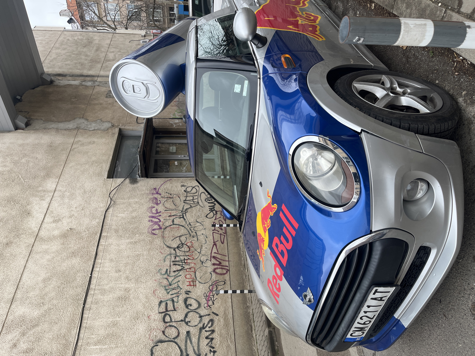 A Red Bull-branded Mini Cooper is parked on a street in Sofia, Bulgaria. The car has a large Red Bull can attached to its roof. The license plate number is CM6211AT. The car is parked beside a building with graffiti on its wall. A black and white striped bollard stands near the car. The weather appears to be overcast.