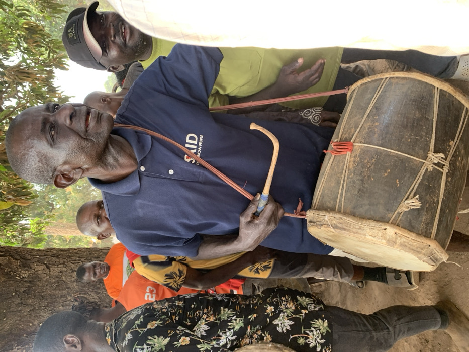 An older man in a blue USAID shirt holds a curved wooden stick, likely a drumstick, next to a large drum
