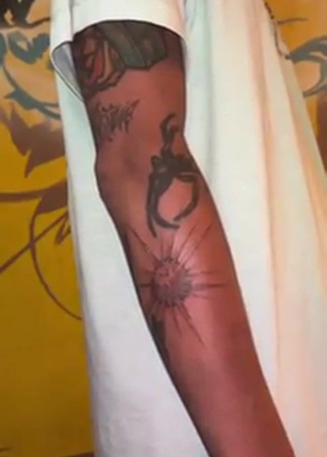 A close-up shot shows a person's left arm adorned with several black tattoos