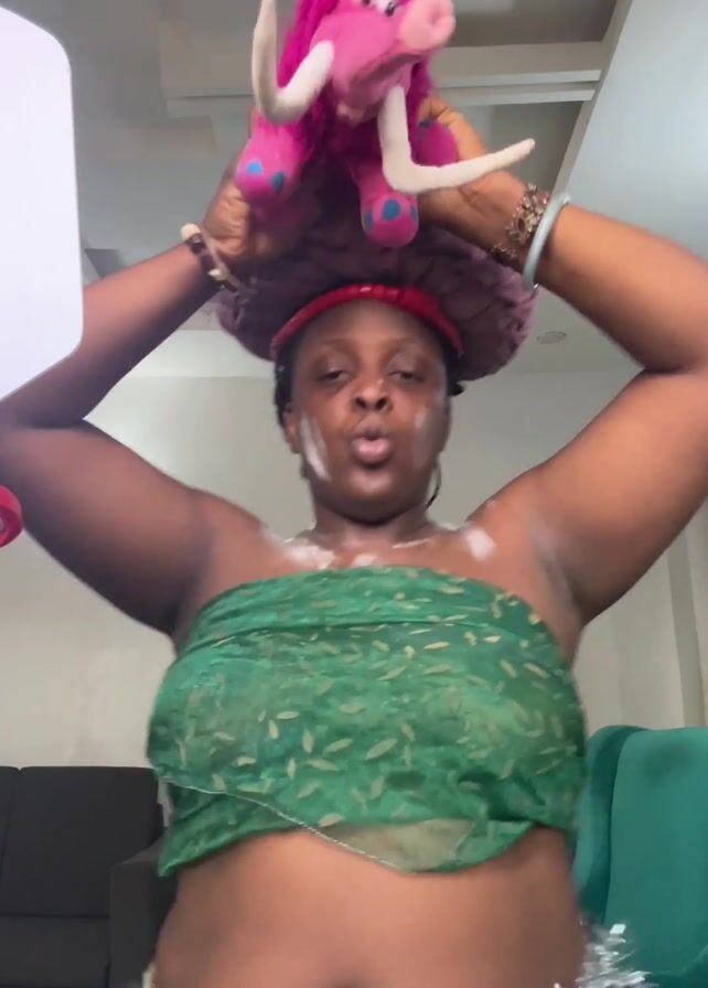 A woman is facing the camera while holding her arms up with her hands on top of her head. On her head is a tan-colored head wrap with a red headband on top. Balanced on top of the head wrap is a pink stuffed elephant toy. The woman is wearing a green patterned tube top, and around her waist she is wearing silver tinsel. White makeup is on her forehead and chest. A gray couch and a green chair are visible in the background. There is a photography light panel on the left. She is puckering her lips.