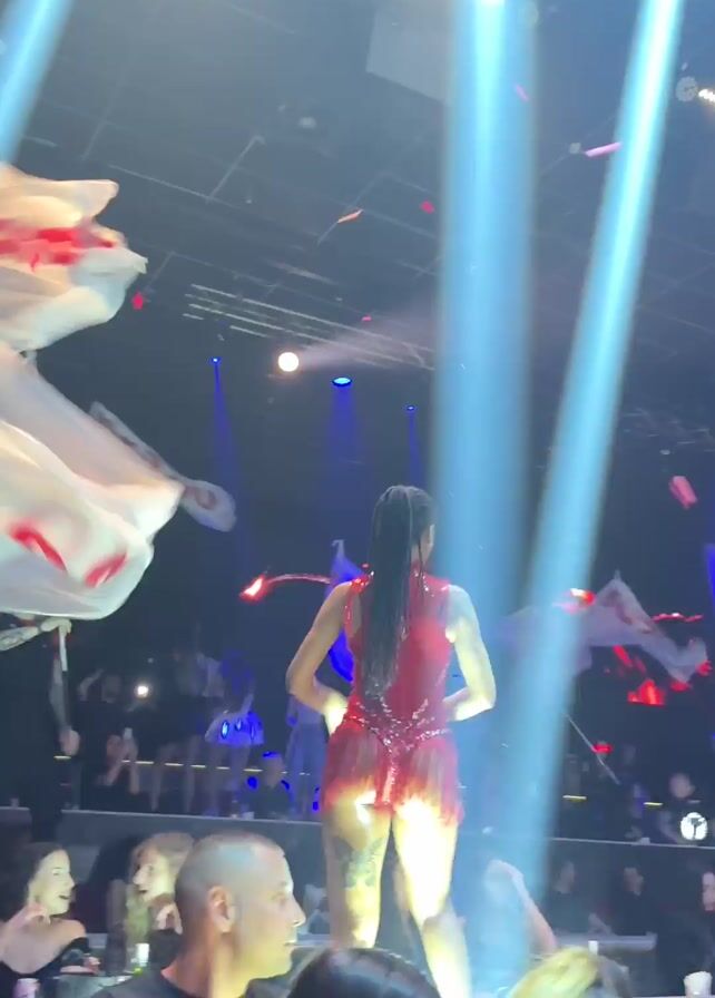 crowded nightclub with people dancing and waving flags. The club has a high ceiling with red and black decorative panels and circular LED lights. A woman in a red, sequined dress is dancing on a platform, and a man to her left is holding a microphone. Many attendees are holding flags with red lettering, waving them in the air. The lighting in the club is a mix of red, white, and blue, creating a dynamic atmosphere.