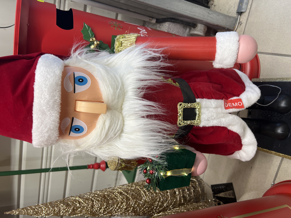 The image displays a static indoor decorative arrangement within a retail setting in Mondeville, France. The primary subject is a large, Santa Claus-themed nutcracker figure. This figure wears a red velvet-like coat with white faux fur trim, a black belt with a rectangular gold-colored buckle, and a red Santa hat with a white faux fur brim. Its face features light-pink skin, prominent light-blue eyes with white reflections, a light-brown nose, and a voluminous white synthetic beard and mustache. Gold epaulets with fringe adorn its shoulders. The figure's left hand holds a dark green rectangular gift box decorated with a small evergreen sprig, red berries, and several small illuminated warm white LED lights. A red "DEMO" tag is visible hanging from the lower right side of its coat. The nutcracker stands on a dark, gold-trimmed base, wearing black boots. To the figure's left, a golden conical wire-mesh decorative tree is positioned. To its right, a tall, red, cylindrical decorative object resembling a post box, adorned with green holly and red berries, stands. The floor is covered with light-colored tiles, and the background shows a blurred grey wall or shutter and parts of a green vertical stand.