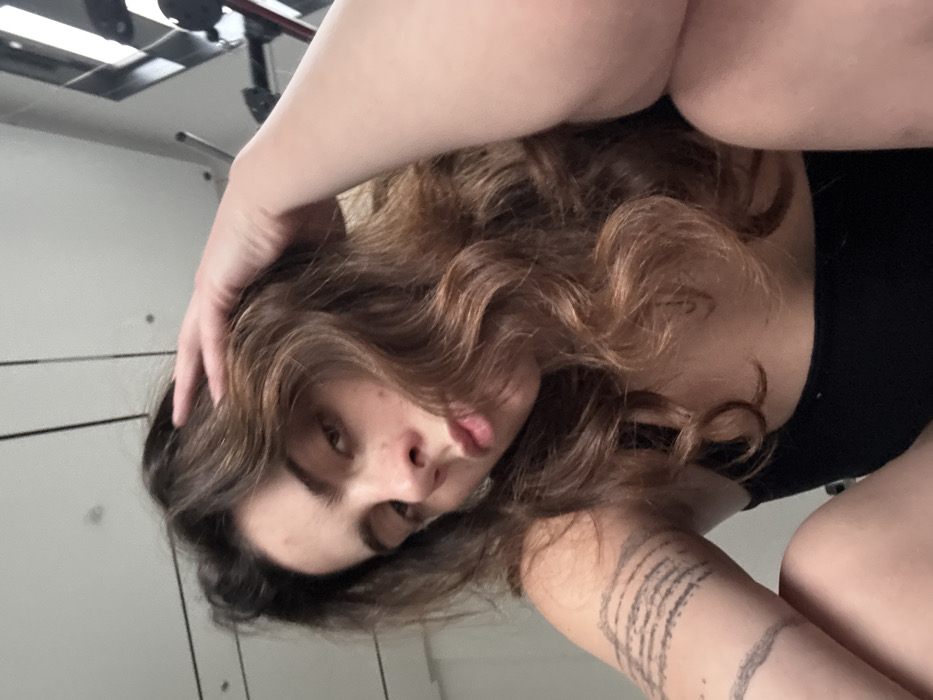 A fair-skinned person with long, wavy brown hair and a black top poses at an oblique angle. Their hand rests on their head. Lines of ink decorate their arm, appearing as curved, concentric segments. The background features a metallic rack structure above and white, plain walls. Their expression is neutral, and their eyes are partially closed.
