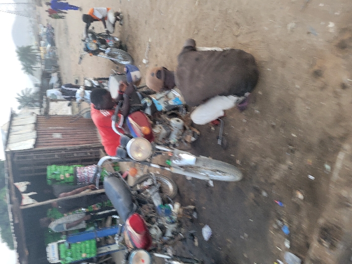 A cluttered scene shows a dirt ground area with several motorcycles and people nearby