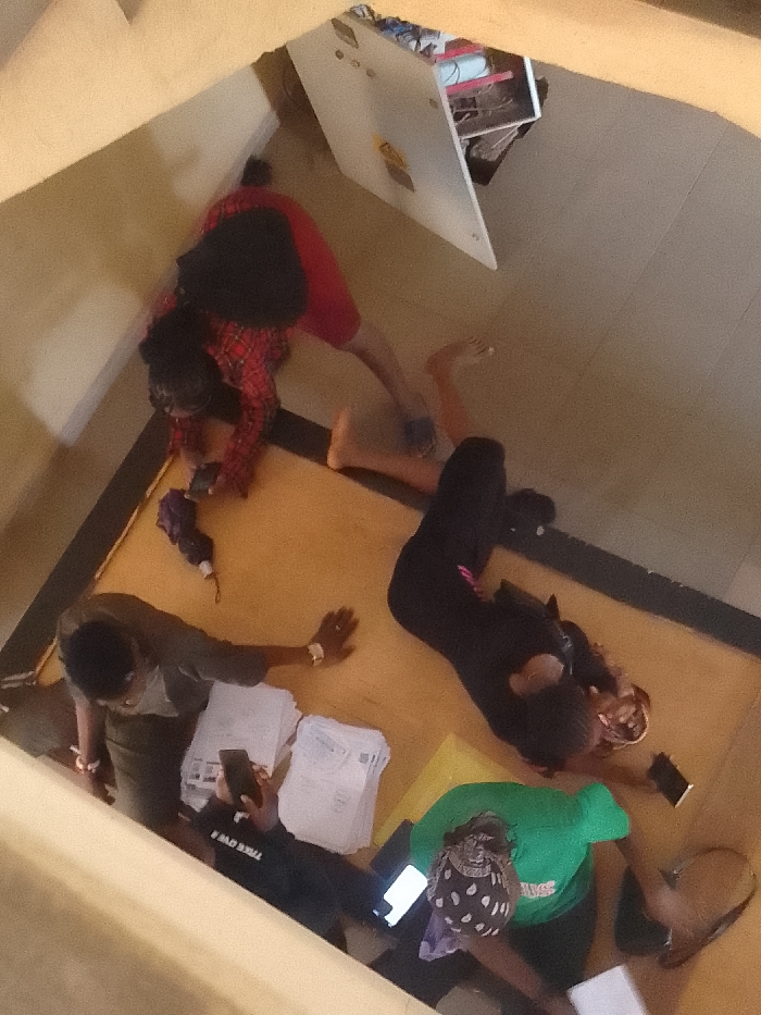 The scene depicts five individuals situated on a light-colored tiled floor within an indoor environment in Nsugbe, Nigeria. The image is captured from a high-angle perspective, looking down into a rectangular space partially framed by a beige architectural element. One individual, wearing a red and black plaid shirt, red shorts, and a black backpack, is kneeling on the floor, leaning forward. Another individual lies on their back, propped on their elbows, wearing dark attire, and engaging with a smartphone. A third person sits upright against a wall, dressed in a dark grey top with a wrist-watch, positioned near multiple stacks of white papers on the floor. A fourth individual, in a black t-shirt with white lettering, sits holding a smartphone. The fifth person, wearing a green t-shirt and a patterned headwrap, also sits, holding a smartphone with a brown bag beside them. At least three individuals are actively using smartphones. A purple fabric object is visible on the floor near the kneeling individual. In the upper right background, a white shelving unit containing various items is partially visible. The setting appears to be a common indoor area.