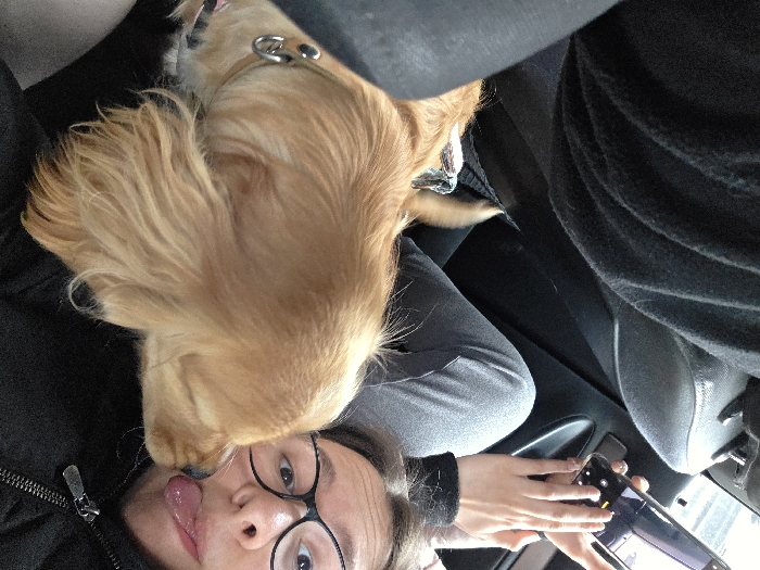 The image depicts the interior of a vehicle. A light-brown, long-haired dog, wearing a light-colored collar with a metal ring, is positioned on the left, with its head near the face of a female individual on the right. The woman wears dark-rimmed eyeglasses and a dark, zippered top. She is looking directly at the camera, sticking her tongue out. Her left hand, visible on the right side of the frame, holds a black smartphone horizontally, with her right hand also interacting with the device. The woman is wearing light gray trousers. A dark fabric seat is visible behind the woman and to the far left. The specific location within the city of Pleven, Bulgaria, is not discernible from the visual information provided.
