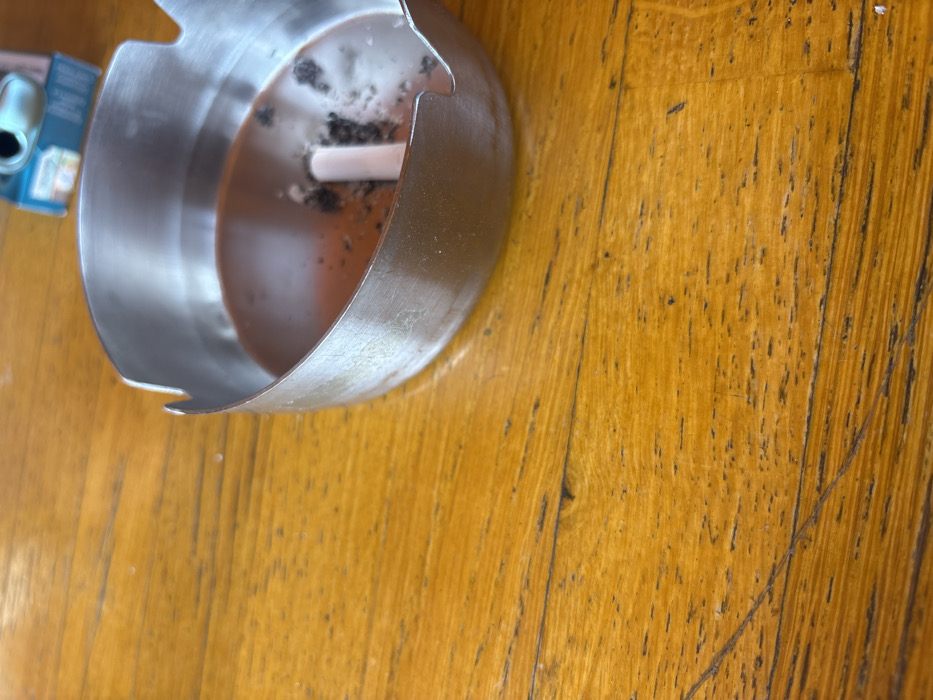 - "The scene depicts a close-up, angled view of a metallic, circular ashtray resting on a light orange-brown wooden surface in Veliko Tarnovo, Bulgaria" by FM-oSecL2, licensed under CC BY 4.0
