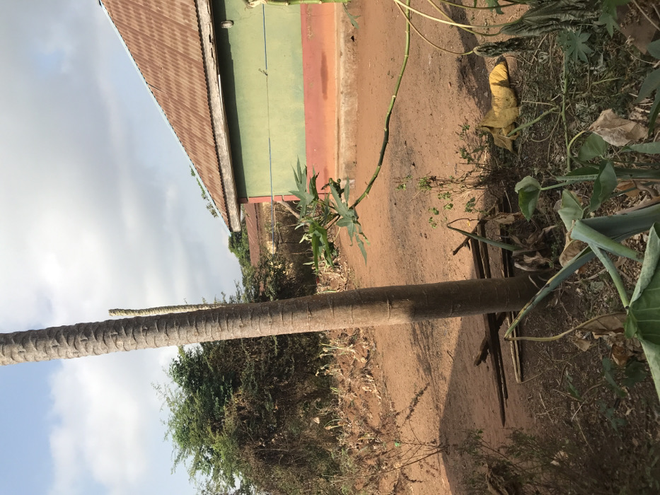 This image depicts an outdoor scene in Ogodo, Nigeria, characterized by an unpaved, reddish-brown dirt ground. In the foreground, a prominent, tall, slender tree trunk, likely a papaya tree, stands slightly left of center, extending out of frame upwards. To its right, a plant with large green leaves and a horizontal branch, also resembling a papaya tree, extends across the mid-ground. Near the base of the prominent tree, several wooden planks or pieces of lumber lie on the ground. Further right, a crumpled yellow fabric object is visible on the dirt. In the mid-ground, a single-story building with a rusted corrugated metal roof is visible. Its walls are painted horizontally in two sections: an upper light green-teal section and a lower reddish-orange section. A thin blue line, possibly a rope or wire, runs horizontally across the green wall section. Behind this building and to the left, dense green foliage and trees are present. Another building with a similar roof is partially visible in the distant background, obscured by vegetation. The sky above is partially cloudy, showing areas of light blue sky with white and grey clouds. No people or animals are visible, and no specific actions or interactions are depicted.