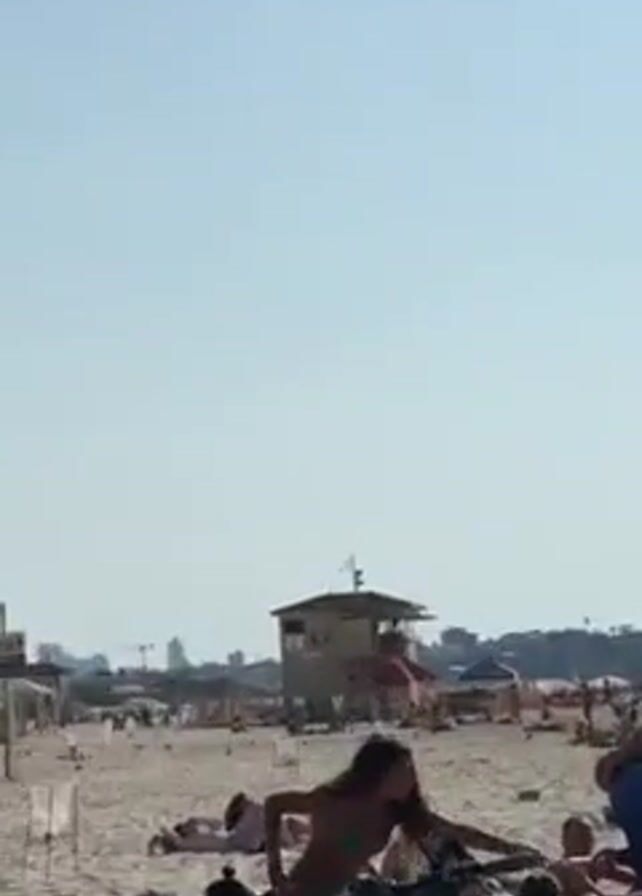 crowded beach on a sunny day. People are sitting, lying down, and walking around on the sand. Some are sunbathing, while others appear to be talking or relaxing. In the background, there are tall buildings and a lifeguard tower. The water is visible, with people swimming and enjoying the sea. There are personal belongings scattered around on the sand, such as bags, towels, and shoes. The sky is clear and blue.
