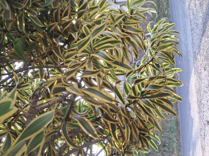- "The image presents a close-up, upward-angled view of dense, variegated foliage from a plant consistent with a Dracaena reflexa 'Song of India' species, situated outdoors in Bogor, Indonesia" by FM-OcJMj2, licensed under CC BY 4.0