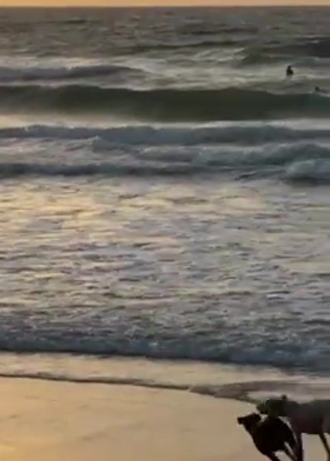 beach scene at sunset. The sky is a gradient of yellow and orange. The ocean is visible with waves rolling towards the shore. Two dogs are running and playing on the beach, initially close to the shoreline. They then run into the water, creating splashes. More dogs appear, and they run and splash in the water together. In the background, some coastal structures are visible.