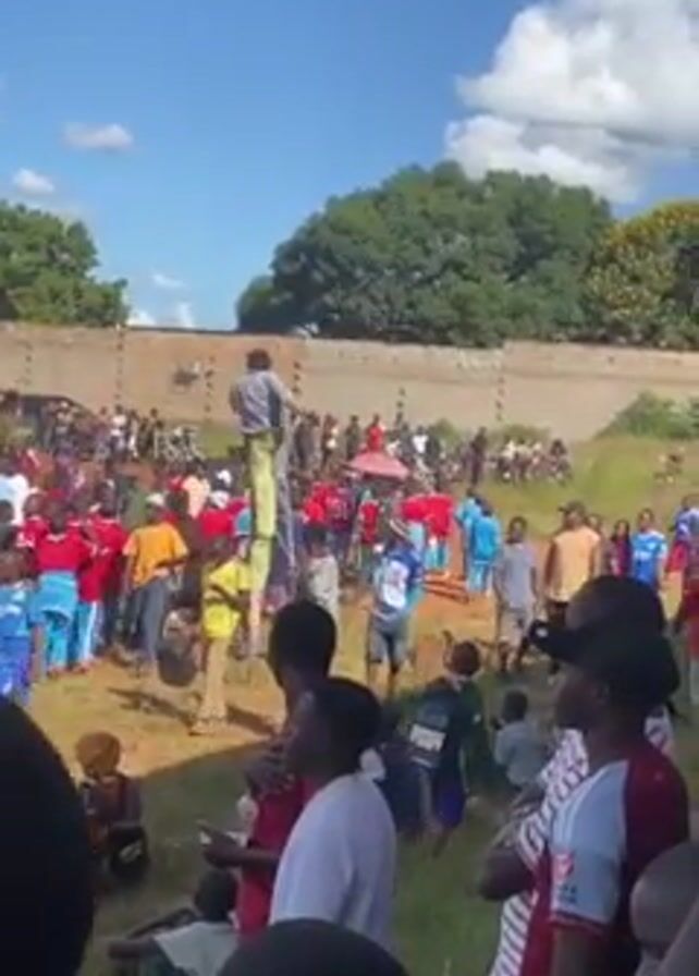 large crowd of people gathered in an open field, likely for an event or celebration. The majority of the individuals appear to be dressed casually in colorful clothing, with some wearing what looks like sports team jerseys. A person stands elevated above the crowd, seemingly on stilts or some other platform, drawing attention. The environment is a grassy field surrounded by a low wall or structure in the background. There are trees in the distance, and the sky is visible with scattered clouds. The general atmosphere suggests a lively and communal gathering.