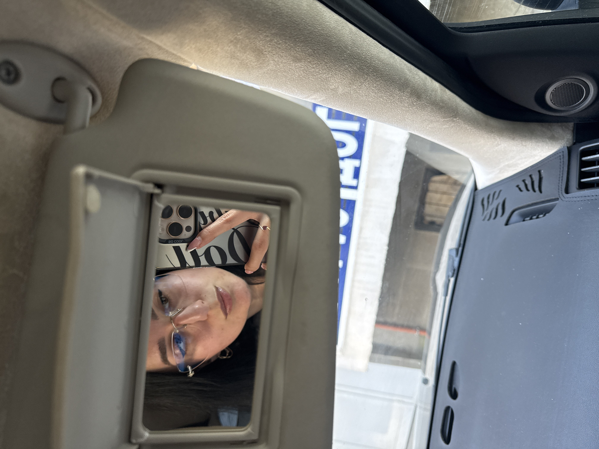 An interior shot depicts a woman's reflection captured in a vehicle's lowered sun visor mirror