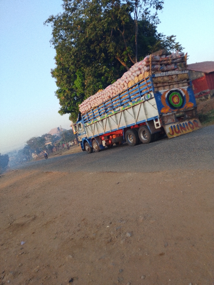 A truck heavily laden with goods, possibly potatoes, is parked on an asphalt road beside a dirt shoulder. The truck's trailer is blue and white with red accents, and its back features colorful circular patterns and the word "JUNIOR". A large tree looms behind the truck. In the background, a hazy landscape includes a distant hill and a motorbike on the road. The sky is pale blue, suggesting early morning or late afternoon lighting.