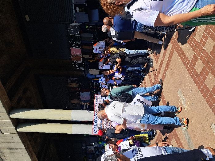 An outdoor scene captures a public gathering under an elevated concrete structure in an urban area of Caracas, Venezuela, likely a commercial district. Approximately 20-30 individuals, primarily adults of varying ages, are present in casual attire. Many are holding white signs with black text; one sign prominently displays "LIBEREN A TODOS LOS PRESOS POLITICOS" (Free All Political Prisoners), and another, partially visible, reads "Casi Canas ¡En Resistencia!" (Almost Grey Hairs, In Resistance!). A central group is clustered around a person holding a microphone, with a black tripod nearby, suggesting a public address or interview. In the background, against a dark wall, multiple clothing racks display various garments for sale, indicating street vendors or an informal market. The ground is paved with patterned reddish-brown and lighter-colored interlocking tiles. The elevated concrete structure is supported by two prominent, light-colored concrete pillars, and bright daylight illuminates the scene, casting distinct shadows.