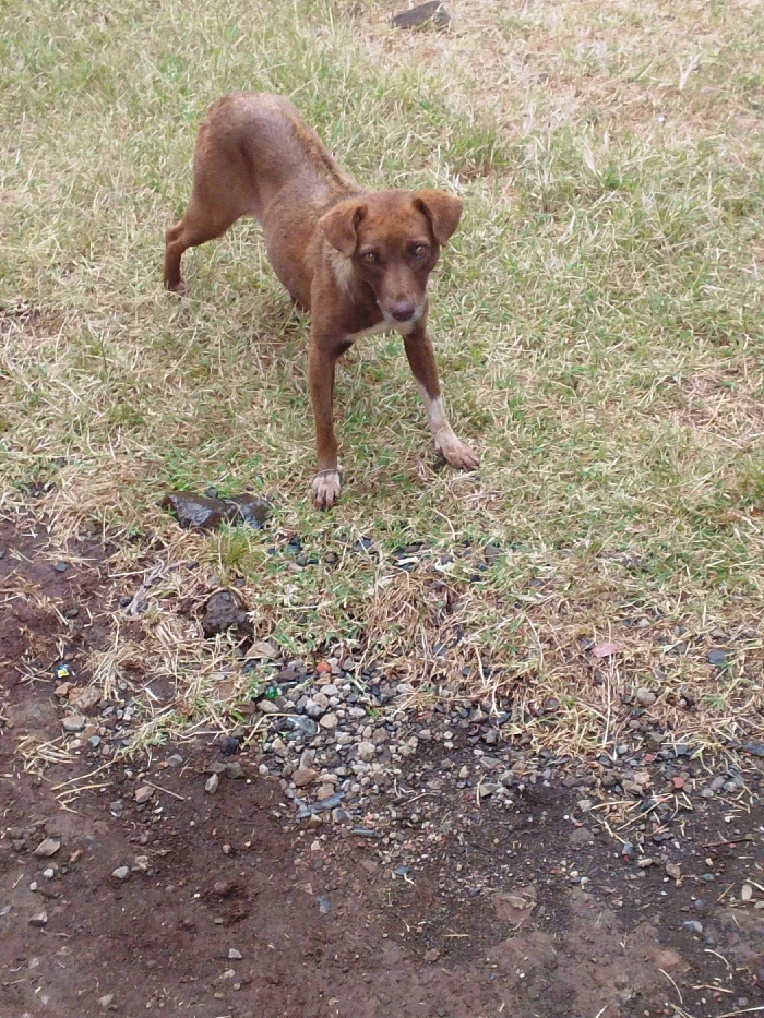 The image displays a solitary brown dog standing in an outdoor setting in Ndeiya, Kenya