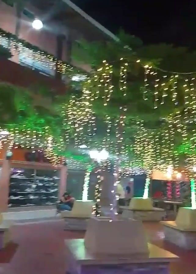 The video depicts an outdoor courtyard at night illuminated by numerous strings of light hanging from trees and lining the upper facade of a building