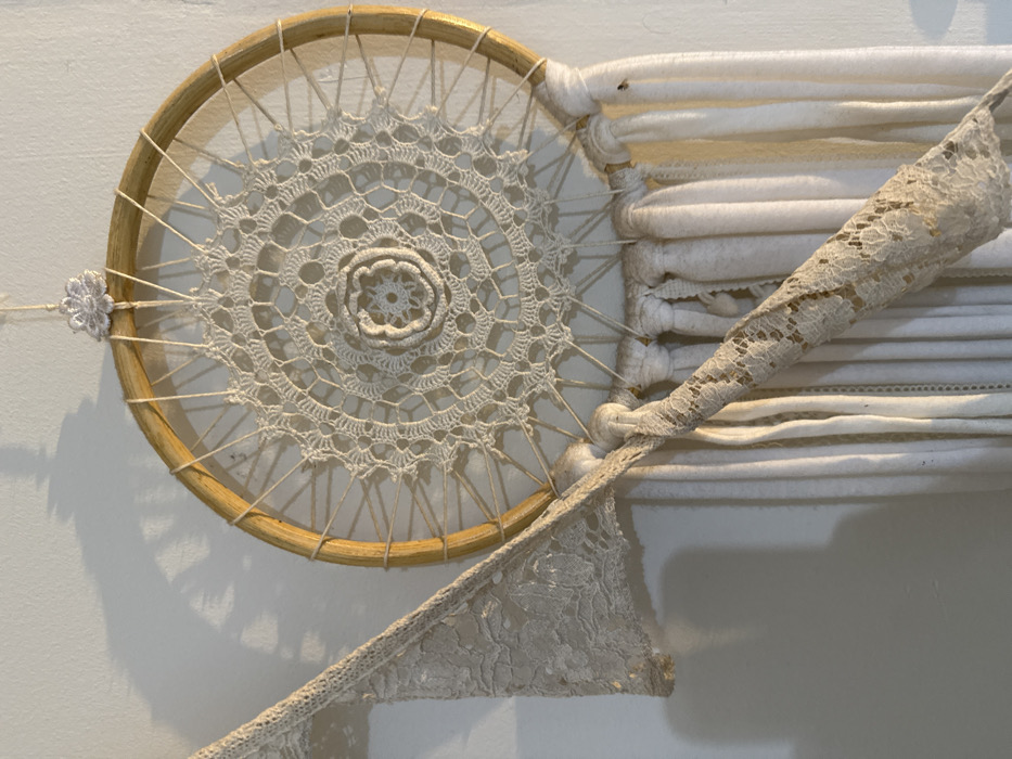 A detailed, upward-angled close-up depicts a handcrafted cream-colored dreamcatcher-style wall hanging against a plain, light-colored wall
