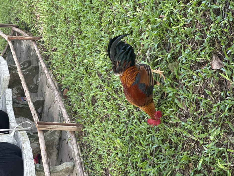A rooster stands on a patch of green grass, with its head down as if pecking at the ground. The rooster has a vibrant red head and neck, transitioning to brown and black feathers on its body and a glossy black tail. To the left of the rooster, there are stone steps lined with a wooden railing, leading upwards. A small brown chick stands above the stone steps.