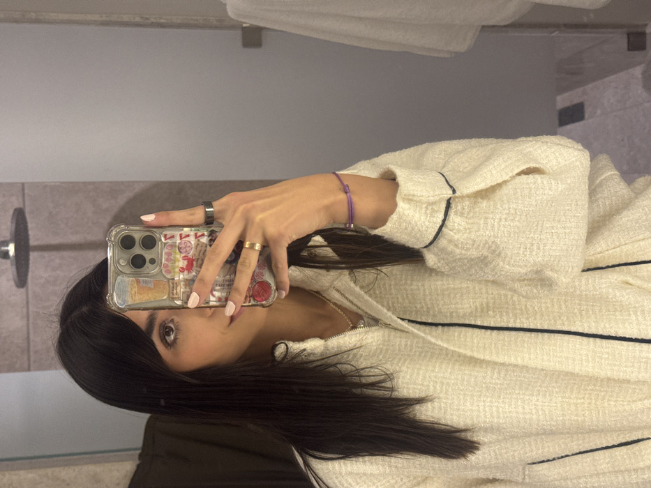A woman in a white, textured jacket takes a mirror selfie with a smartphone. The phone case is transparent with stickers. She wears rings on her fingers and a purple bracelet. Her long, dark hair is partially visible. The background includes a mirror, a towel rack, and tiled walls. The image appears to be rotated, presenting a sideways view.