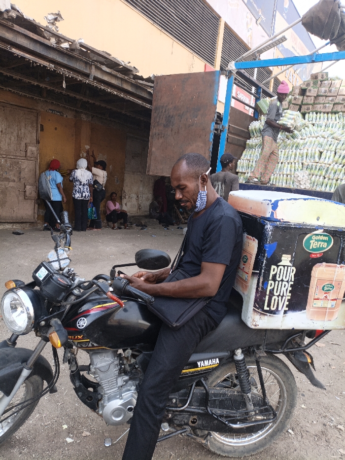 The image depicts an outdoor commercial or market scene in Fagge C, Nigeria, during daylight hours. In the immediate foreground, a dark-skinned male, wearing a black t-shirt and black pants, is seated on a black Yamaha YBR 125 motorcycle. A blue and white checkered face mask hangs below his chin, and a black messenger bag is slung over his shoulder. He is looking down at his hands, which appear to be operating a mobile phone. The motorcycle is equipped with a large, white delivery box on its rear, branded with "Golden Terra" and the slogan "POUR PURE LOVE," alongside an image of cooking oil. Behind the motorcycle and rider, a group of individuals is visible near a worn, yellowish-brown building with closed, weathered doors. Three women are standing, two conversing while a third appears to be interacting with the building's facade. Another woman in a pink top is seated on the ground to their right. Further right, a light-blue, open-back truck is heavily loaded with numerous stacks of white-packaged goods, possibly food items. A dark-skinned male in a pink beanie and patterned pants is standing on the truck bed, actively handling these packages, indicating loading or unloading activity. Another male figure in a dark t-shirt is partially visible near the truck. The ground is unpaved and dusty. The background includes the upper section of the yellowish-brown building, with some dilapidated structures above it, and a section of a more modern building with horizontal grates.
