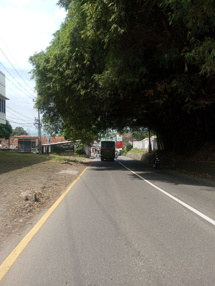 The scene is located in the city of Chhenangri_Rishor, Bhutan, depicting a daytime street view along a paved road. The image is captured from a low vantage point on an asphalt road, looking forward into the distance. The road features a solid yellow line on its left edge and a solid white line further to the right, indicating traffic lanes. To the immediate left of the yellow line, a paved shoulder or sidewalk of light-colored concrete blocks is visible, with patches of dry leaves and debris. On the left side of the road, beyond the shoulder, a multi-story building with a light-colored facade and dark-framed windows stands. Multiple utility poles with a network of overhead electrical wires are prominent in this area. Further along the left, several single-story structures with reddish-brown tiled roofs are present. One such structure displays a green sign with white text that reads "Citra Senja residence." A green, medium-sized passenger bus is positioned in the midground, traveling away from the viewer in the right lane of the road. Its rear is visible. Behind the bus, other smaller vehicles, including motorcycles, are partially discernible further down the road. The right side of the road is bordered by dense, dark green foliage, primarily consisting of large bamboo clumps, which form an overarching canopy, casting deep shadows onto the road and roadside. A stone or concrete retaining wall is visible along the base of this embankment of foliage. A dark-colored motorcycle is parked or stationary beneath the canopy on the right shoulder. Further down the road on the right, additional buildings and what appears to be a red and white sign are visible. The sky above is bright with scattered white clouds, suggesting clear daylight conditions. In the distant background, faint outlines of hills or mountains are visible beneath the horizon. No specific human figures are clearly identifiable in the immediate foreground or midground.