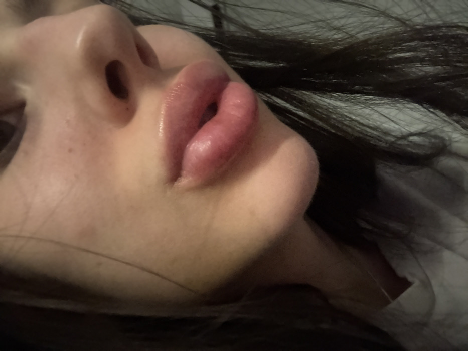 The image displays a close-up, oblique view of a human face, captured from the viewer's right and angled slightly upwards. The primary focus is the mouth, featuring full, reddish-pink lips with a glossy appearance, held slightly parted. The lower lip exhibits distinct fullness. Visible facial anatomy includes the tip and bridge of the nose, a partial view of the right nostril, and a segment of the right eye at the top edge of the frame. The skin complexion is fair to medium, exhibiting small pores and scattered freckles on the cheek and around the nose. Dark, long hair frames both sides of the face. A light-colored fabric, consistent with a garment such as a t-shirt or shirt, is partially visible in the lower-left portion of the image. The lighting is soft and diffused. The immediate environment is indistinct, providing no discernible background details. The specific location in Sofia, Bulgaria, or any other geographical area, cannot be determined from the visual information present.
