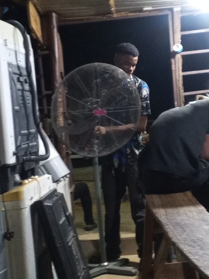 A low-light image depicts an indoor space, possibly a workshop or utility room, within the city of Unknown, Unknown. In the center, a young male individual with short dark hair, wearing a patterned blue and black short-sleeved shirt and dark trousers, stands behind a large, dark grey standing fan. His hands are positioned near the lower part of the fan's stand, suggesting he is operating or adjusting it. To the right, another individual, partially obscured from the chest down, is seated on a rough wooden bench, wearing a dark t-shirt. On the far left, a tall white appliance or machine with black tubing and wires is visible, with a smaller black electronic device resting against its base. The floor appears light-colored. In the background, to the right of the central figure, a dark opening or unlit area is visible, framed by wooden structures. A bare bulb or bright light source is visible in the upper right quadrant of the image, illuminating the scene. A third individual's lower legs and feet, wearing dark trousers and shoes, are visible near the bottom left corner, behind the white appliance. No direct interaction between the individuals is discernible.