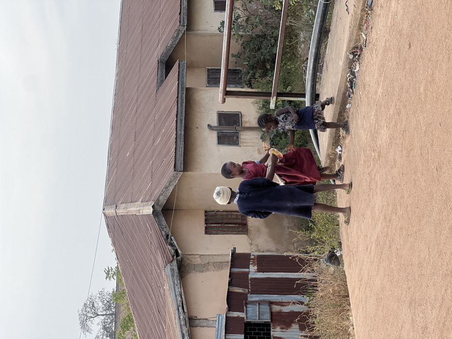 A group of three children stand outdoors near a tan building with a rusty, corrugated metal roof. One child wears a long, dark blue garment and a white skullcap. Another is in a red dress, and the third is in a blue and white patterned dress. The children appear to be holding or sharing a yellow object. A metal railing is behind them, and there is some vegetation nearby. The ground is dirt or sand.