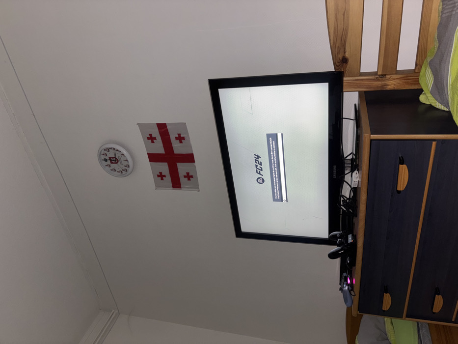 A tilted view reveals a white wall with a clock and the flag of Georgia. A black-framed TV displays "FC24" and a connection error message. The TV is mounted near a dark wood dresser. Visible game consoles and controllers sit behind the TV. The top of a wooden bed frame peeks out on the right.