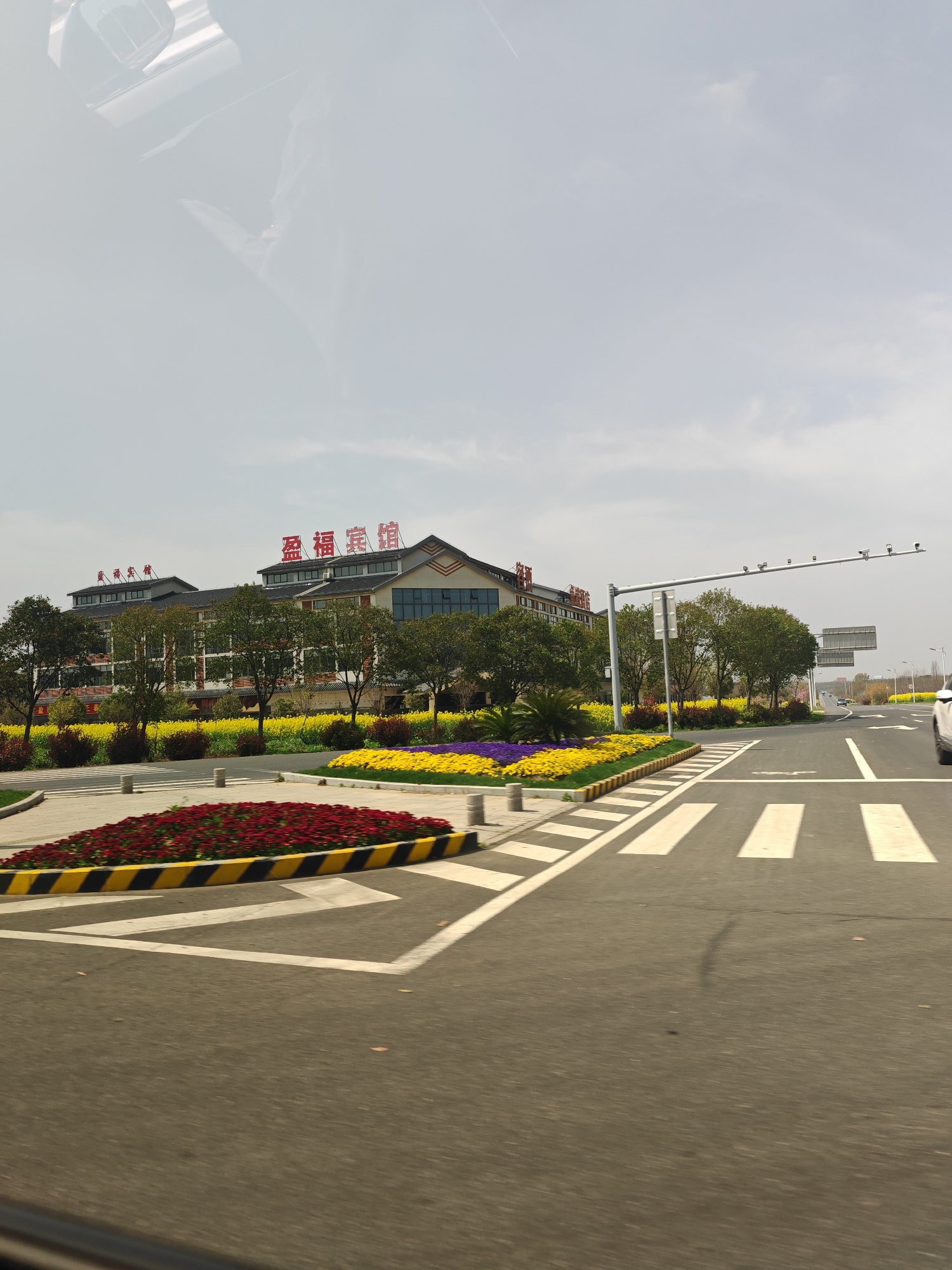 The image displays a daytime scene at a road intersection in Jurong, China, under an overcast sky. The perspective is from inside a vehicle, evidenced by reflections on the top and bottom edges of the frame. In the foreground, a multi-lane asphalt road features white pedestrian crossing stripes and directional arrows. A central traffic island, bordered by a curb painted with black and yellow diagonal stripes, contains a bed of dark red flowers. Adjacent to the road, meticulously landscaped areas include extensive patches of bright yellow flowers, likely rapeseed, interspersed with beds of yellow and purple flowering plants, and numerous green trees. In the background, a multi-story building with a distinct roofline, including multiple gabled sections, is visible. Prominent red Chinese characters spelling "盈福宾馆" (Yingfu Guesthouse) are affixed to the roof. A metal gantry equipped with multiple cameras or sensors spans across the road, with a square road sign positioned beneath it. The rear section of a white vehicle is partially visible on the far right lane, facing away from the viewer. No individuals are present in the scene.