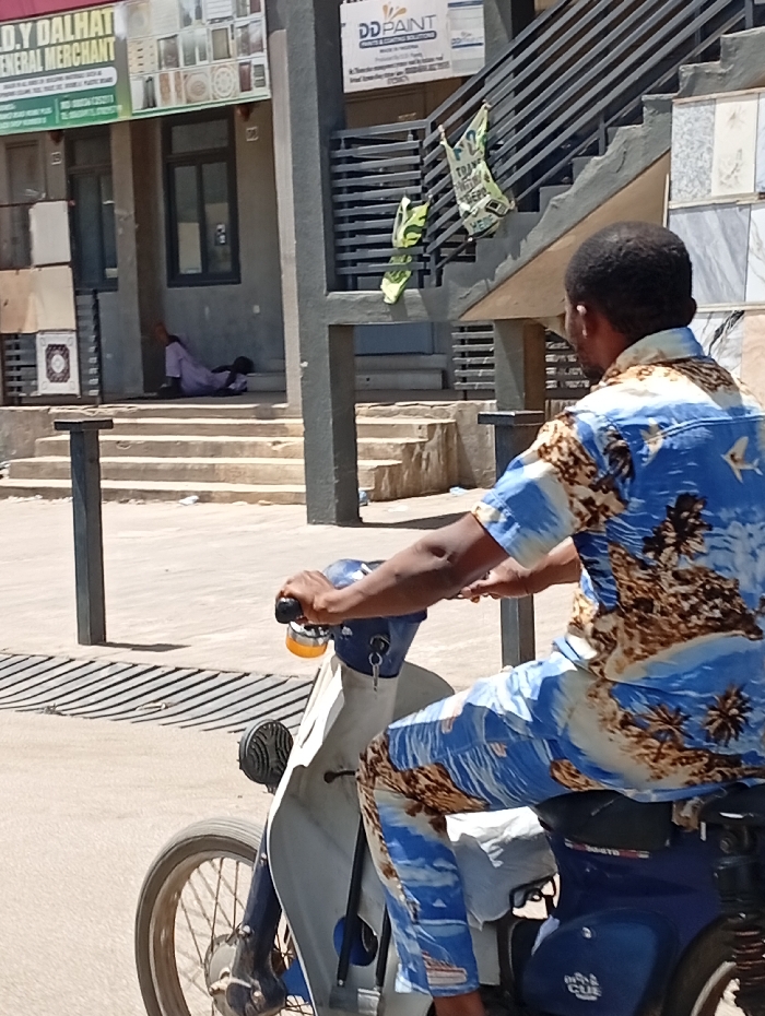 The image depicts an urban street scene in Sabon Gari West, Nigeria, under bright daylight. In the immediate foreground, a male individual with dark skin and short dark hair is seated on a blue and white step-through motorcycle, oriented with his back partially towards the viewer, appearing to be in motion. He is wearing a matching short-sleeved button-up shirt and trousers featuring a blue and white tropical print with islands, palm trees, and ocean elements. His hands are on the handlebars. The midground features a light-colored paved surface, likely a road or an open area, with a metal-grated drain visible on the left side. In the background, two adjacent multi-story buildings line the street. The building on the left features a storefront with a prominent green and white sign that reads "D.Y. DALHATI GENERAL MERCHANT." Various patterned tiles are displayed vertically on the exterior wall to the left of the entrance. The entrance includes two dark-framed windows and a dark door, with concrete steps leading up to it. An individual, dressed in light purple clothing, is lying prone on the ground at the base of these steps. The building to the right features an external concrete staircase with dark horizontal railings. A blue and white sign reading "DD PAINT" is visible on the upper part of this building. Two green and yellow fabric banners or flags are suspended from the staircase railings; one partially legible banner includes the text "TRAVELING TELESCOPE HERE." Further to the right, another section of wall displays more patterned tiles. Strong shadows indicate a high sun position.