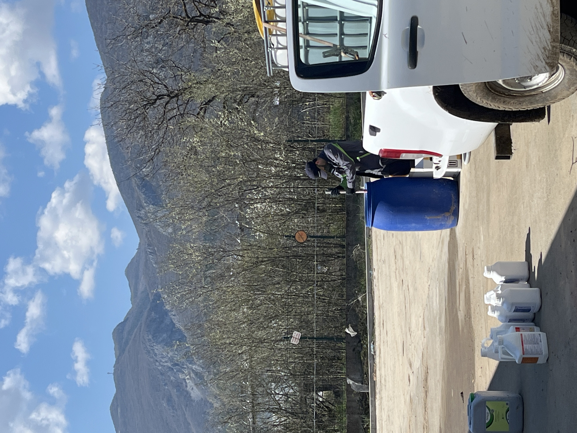 A person in work attire stands near the open tailgate of a white pickup truck, apparently transferring liquid from a blue barrel into smaller containers
