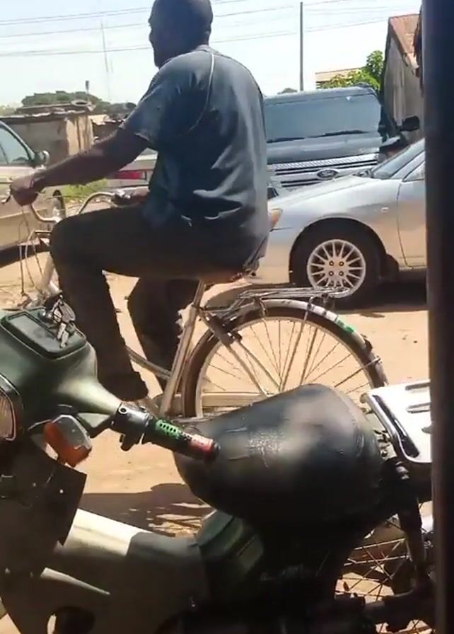 A man is riding a silver bicycle away from the camera on a dirt road. He is wearing a dark-colored shirt and pants. There are several cars parked in the background, including a minivan and a dark green sedan. In the foreground is a parked green motorcycle. The road is mostly dirt with some patches of gravel. The sky is blue and clear. There are some buildings visible in the background, with one sign saying "Motors" on it.