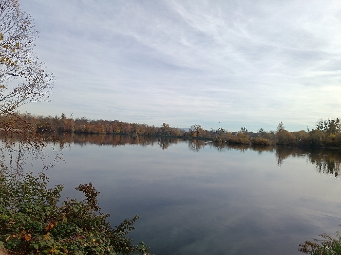The scene presents a horizontal landscape view of a placid body of water located in Bischheim, France
