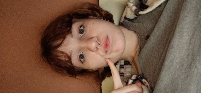 A young individual, appearing female, with short, reddish-brown hair and bangs, is centered in a close-up indoor portrait