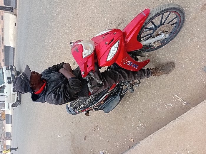 A male individual is seated on a stationary red scooter-style motorcycle on the shoulder of an asphalt road in Rijiyar Zaki, Nigeria