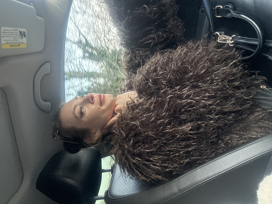 An image depicts a female individual seated inside the passenger compartment of a vehicle, viewed from the driver's side. The specific location within the city of Nerin, Montenegro, cannot be determined from the visual information present in the image. The subject is a woman with her hair pulled back, wearing eyeglasses pushed up onto her head. Her facial features include defined eyebrows, eyeliner, and lip gloss. She is turned slightly to her right, looking out the vehicle's window, with a subtle smile and her right hand resting with fingers against her neck/chin area. She is wearing a prominent dark brown, shaggy or textured long-pile coat or jacket that covers her torso. A dark garment is visible beneath. The vehicle interior shows dark leather seating with a headrest. Overhead, a sunroof mechanism is visible on the ceiling along with a gray grab handle. The passenger-side sun visor is flipped up, revealing a yellow warning label. To the right of the subject, a black handbag with gold-colored hardware is visible. Through the passenger window, a blurred outdoor environment is seen, characterized by bare tree branches against a light sky, suggesting a non-foliage season. The lighting indicates daytime conditions.