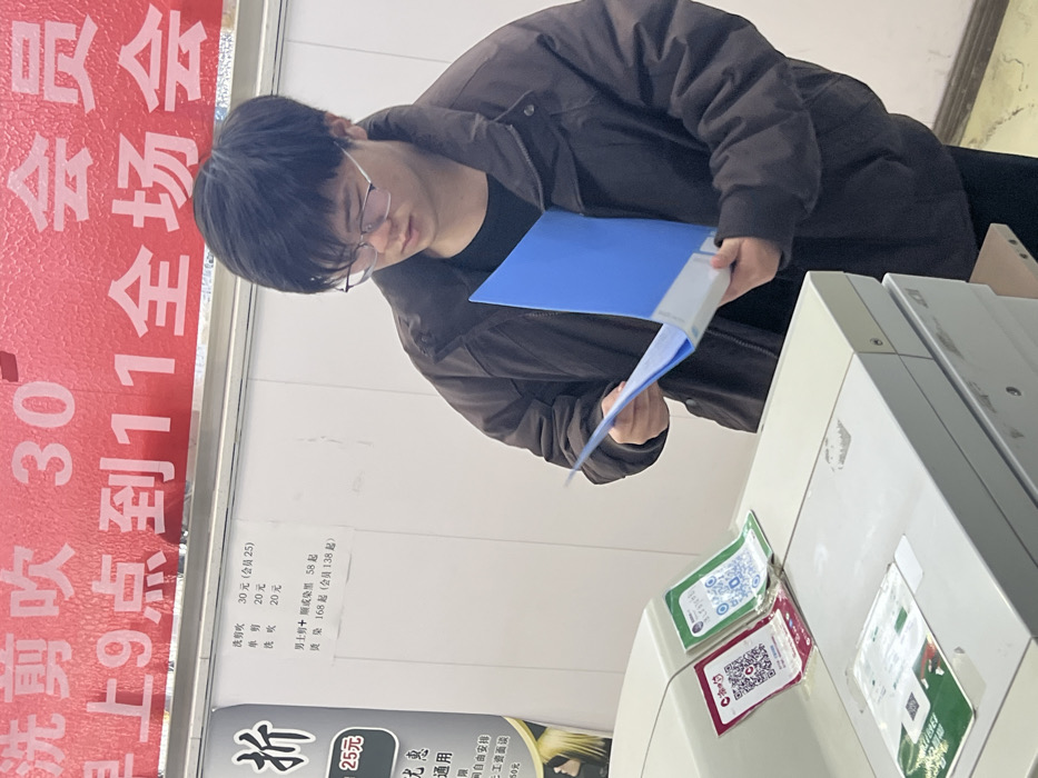 A person wearing glasses and a brown jacket holds a blue folder in front of a white machine with QR codes