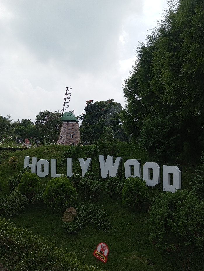 The image depicts a landscaped park area in Tân Kỳ Commune, Vietnam, under an overcast sky. In the midground, large, white, three-dimensional block letters spell "HOLLYWOOD," situated on a green, grassy slope interspersed with dark green shrubs. To the lower right, a red circular sign with a white border contains a diagonal line through a stylized figure and includes text in white, partially legible as "DILARANG." Behind the "HOLLYWOOD" sign, a decorative, non-functional windmill structure stands on a slightly elevated mound. It features a beige and brown brick-patterned base, a green conical roof, and black, open-lattice blades. Further back and to the left of the windmill, a group of at least three individuals are visible on a grassy path, one wearing a light-colored head covering. White flowers dot the landscape in this area. The background is filled with dense green foliage, including tall trees and shrubs, with some trees exhibiting reddish-orange blossoms near the windmill. The right side of the frame is dominated by a large, dark green tree. The sky is uniformly cloudy and light grey.