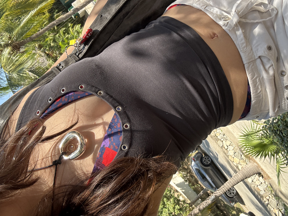A close-up, tilted shot focuses on a person's torso and chest. They are wearing a black tank top with metal eyelets around the neckline over a patterned shirt or bikini top. A large, silver pendant hangs from a black cord. Part of a white jacket or shirt is visible on the right. The background includes a street with a parked car, palm trees, and sunlight.