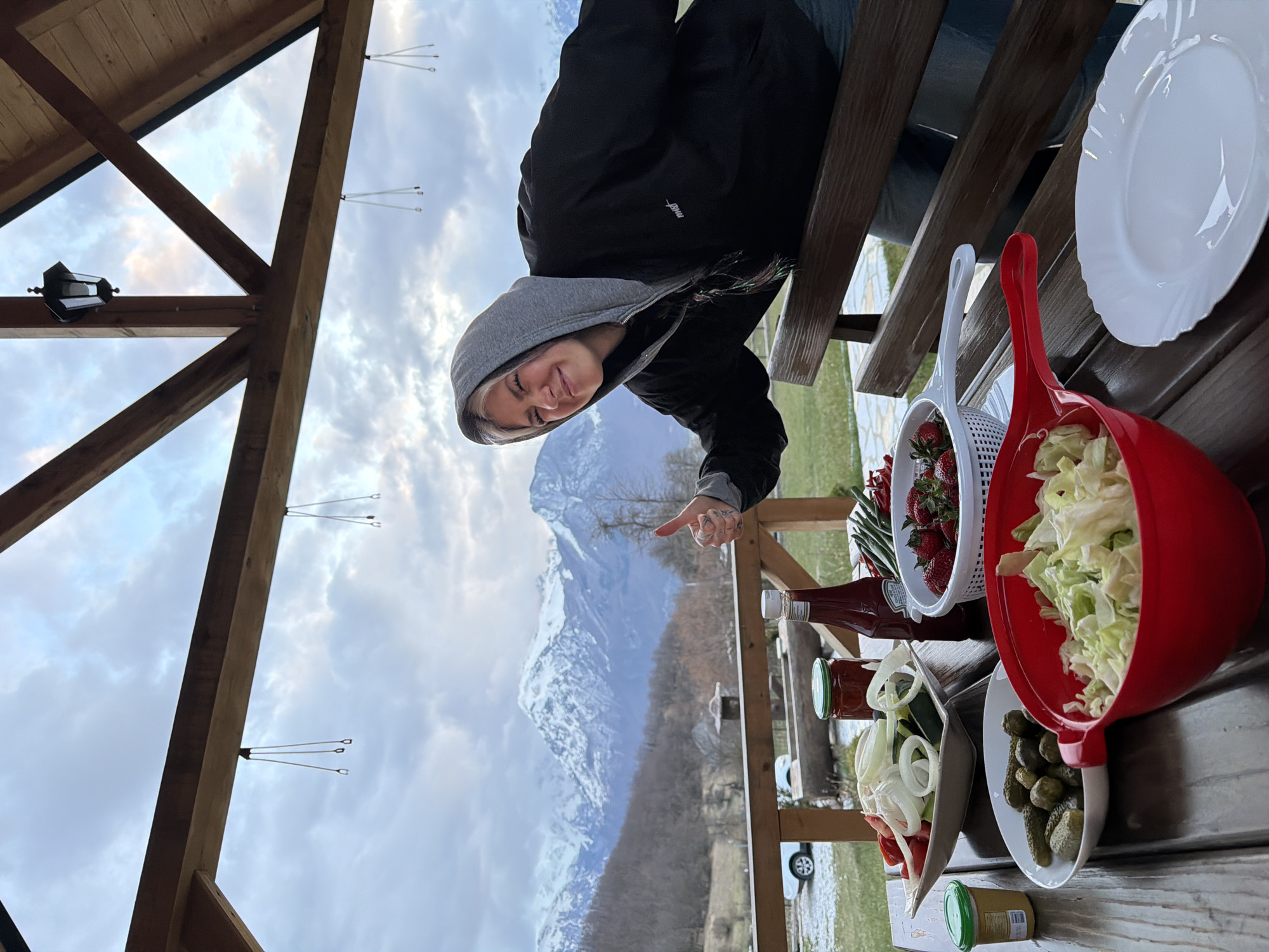 A woman wearing a gray hoodie and black jacket sits on a wooden bench under the roof of a gazebo, points her index finger towards snow-covered mountains, and smiles. On the wooden table in front of her are plates, a white colander filled with strawberries, a red salad bowl filled with lettuce, a bowl with sliced onions and tomatoes, a bowl with gherkins, and bottles of ketchup and mustard. The background shows a car, trees, and cloudy skies. The location appears to be in or near Gusinje, Montenegro, based on the mountain range visible.