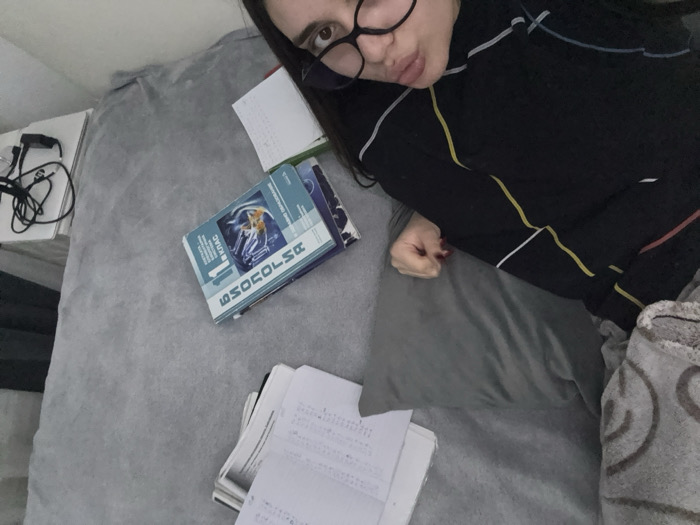 The scene is an indoor bedroom located in Blagoevgrad, Bulgaria. A female individual is depicted lying on her back on a bed, looking towards the camera. She has long dark hair and wears black-framed eyeglasses. Her attire consists of a black long-sleeved shirt featuring thin horizontal stripes in white, yellow, and red. Her right hand is visible, clenched into a fist, with dark nail polish on her fingernails. The bed is covered with grey bedding, including a duvet or comforter and a grey pillow partially supporting the individual's head. A grey blanket with a subtle brown swirl pattern is draped over the lower right portion of the bed, covering part of her body. Academic materials are scattered on the bed surface. To the upper right, near the individual's head, there is a stack of blue and white books, several of which display Cyrillic text. One prominent book cover features a jellyfish illustration and the word "КЛАС" (Class). Adjacent to these books is a smaller, white notebook with a grid pattern. Towards the bottom right of the frame, a stack of loose papers, some containing handwritten notes, rests on the bedding. To the left of the bed, a white nightstand is visible. On its surface, a coiled black charger cable and other small, dark electronic objects are present.